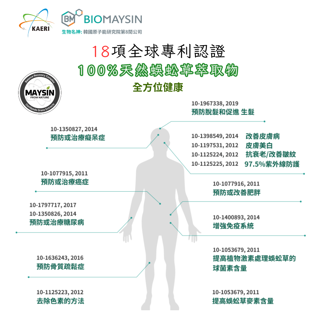 Maysin 是一種抗氧化成分,微量存在於玉米絲和蜈蚣草中,被視為稀有且高附加值的天然產品。自2012年起,韓國原子能研究院 團隊首次成功從蜈蚣草中分離並純化Maysin,並在韓國國內外完成了透過原子能增加 Maysin 微量的技術專利註冊。Maysin在皮膚疾病治療、紫外線防護、促進頭髮生長等方面表現優異,具有廣泛的應用前景。